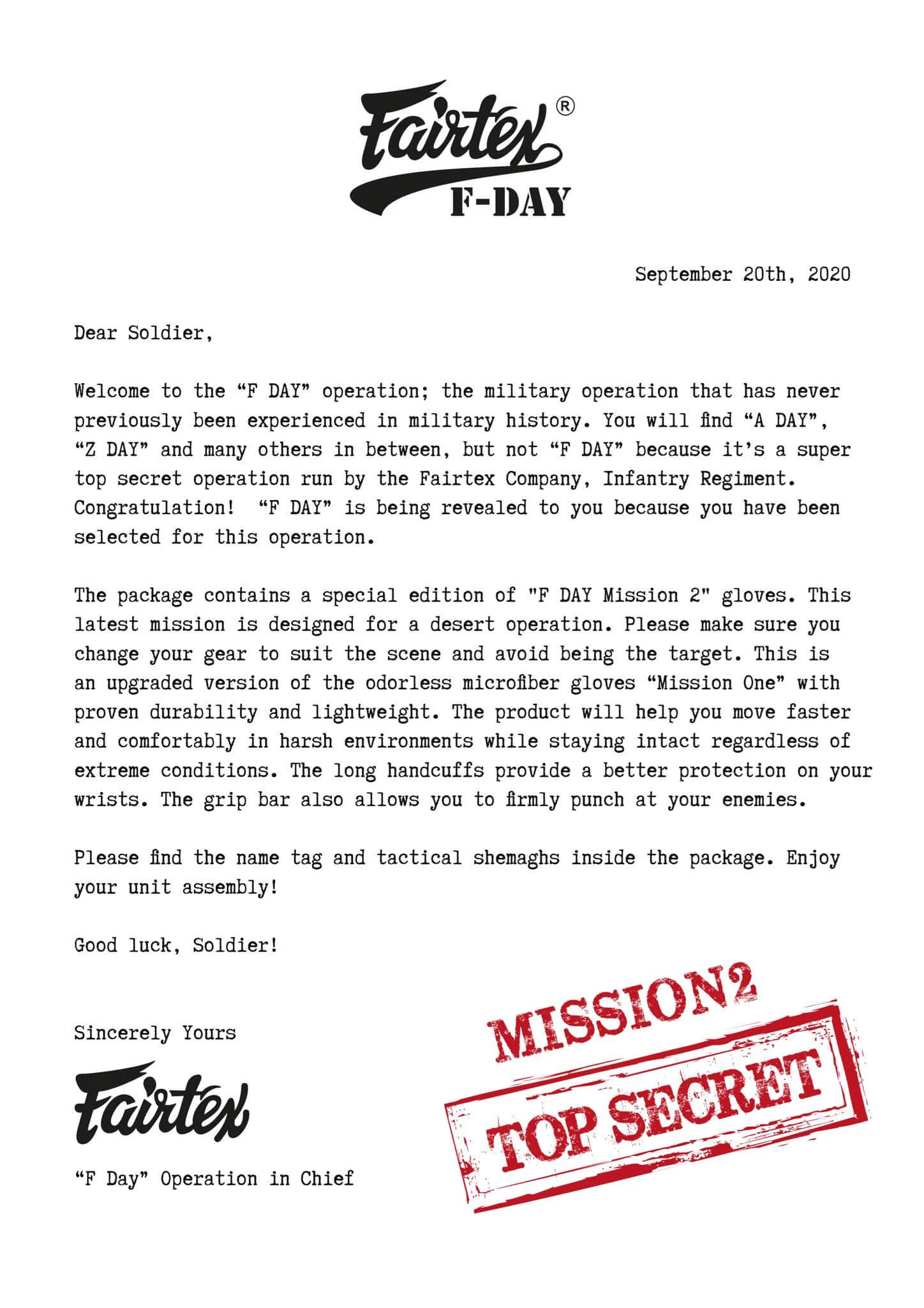 - New premium Boxing Gloves from Fairtex with a complimentary dog tag necklace, “F-Day Mission 2” letter, and shemagh cloth.