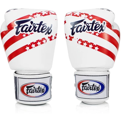 The Fairtex US Flag BGV1 Muay Thai Boxing Gloves are high-quality gloves designed for training and competition in the sport of Muay Thai. Made from premium leather, these gloves are built to last and provide excellent protection for both the user and their training partner. The gloves feature a unique contoured and snug fit, which allows for easy and comfortable hand movement during training sessions. The padding in the gloves is strategically placed to provide maximum protection and support for the hands and wrists. The gloves also feature a Velcro closure system for a secure and customizable fit. Overall, the Fairtex BGV1 Muay Thai Boxing Gloves are a top-of-the-line choice for anyone looking to take their training to the next level.